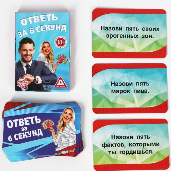 У вас есть 30 секунд, чтобы выполнить задания из набора. На каждой карточке написано условие, а вам необходимо перечислить 5 слов, которые ему соответствуют. Например, назвать пять знаменитых Леонидов или пять самых привлекательных качеств человека. Вытягивайте карточки по очереди, засекайте время и отвечайте на вопросы. Настало время веселиться!