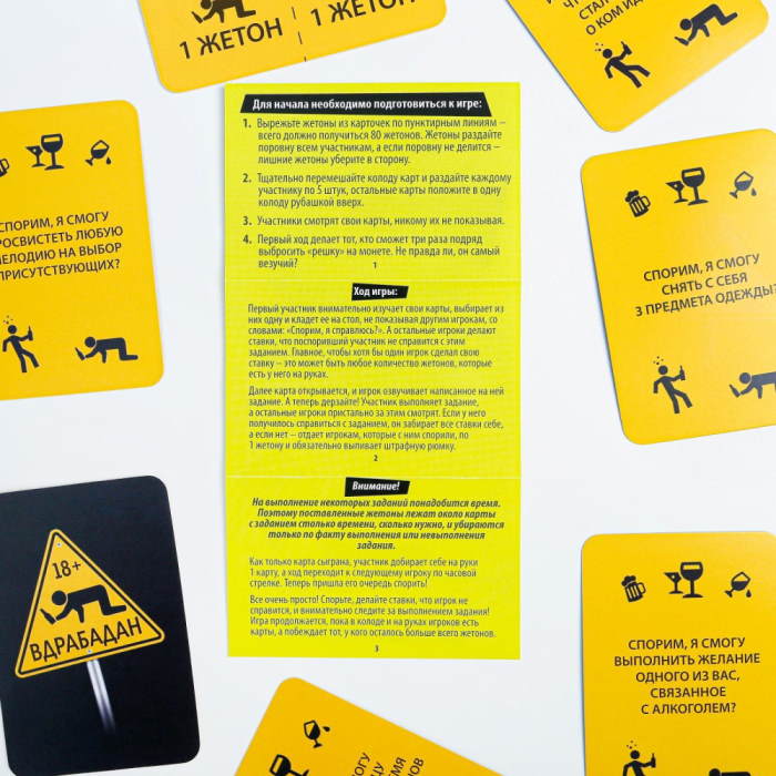 Играть очень просто! Выбирай карточку из своей колоды и со словами «Спорим, я справлюсь?» клади её на стол. Остальные игроки делают ставки на то, удастся ли тебе осуществить задание или нет. Выполнил? Молодец! Забирай все ставки других игроков! А если нет, то каждому отдаёшь по жетону и, конечно, пьёшь штрафную!