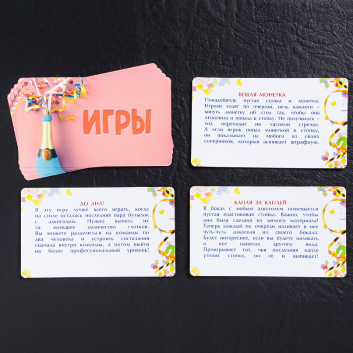 А для того чтобы вечеринка продолжалась весь вечер и всю ночь, мы подготовили целых 7 разнообразных игр для большой и шумной компании: «Алкомарафон», «Вещая монетка», «Снимай или выпивай», «Капля за каплей» и не только!