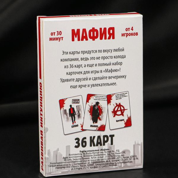 Классические карты в новом исполнении: на каждой карточке изображён персонаж из популярной игры «Мафия». Вы можете играть как в обычные карты, так и поменять формат: раздать карты, определиться с ролями участников, и пусть мафия начнёт охоту!