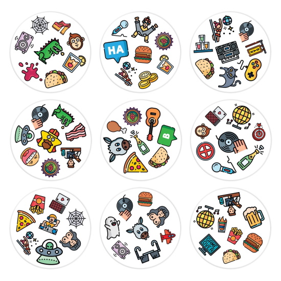 Первый, кто отыщет такую картинку, кричит её название, забирает верхнюю карту из колоды и кладёт её сверху на свою карту. Тем самым он открывает следующую карточку из основной колоды. Теперь совпадения нужно искать уже с другими картинками.