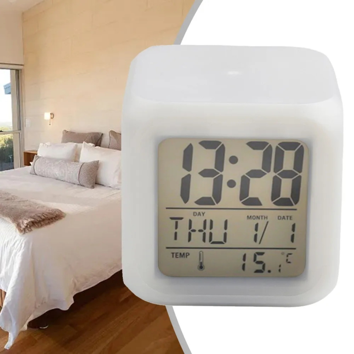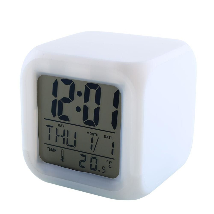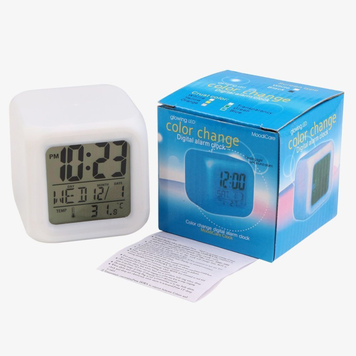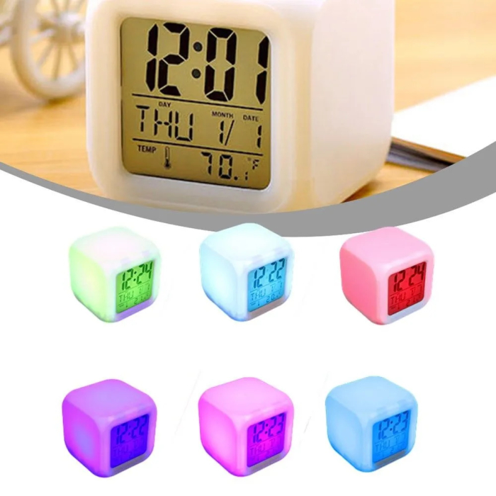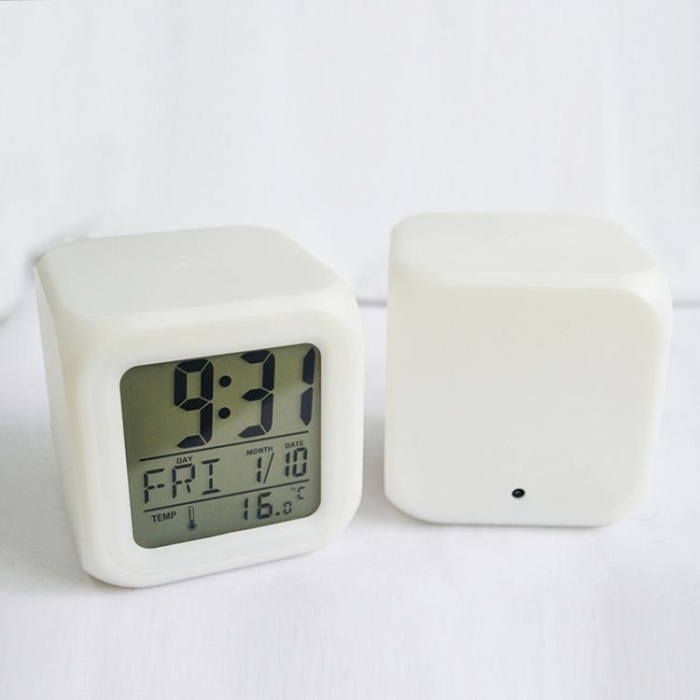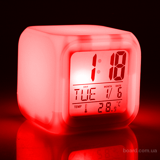 Каждые 5 секунд светящийся куб меняет свой цвет. Часы-будильник, термометр и ночник в одном корпусе! Эффектная штука!