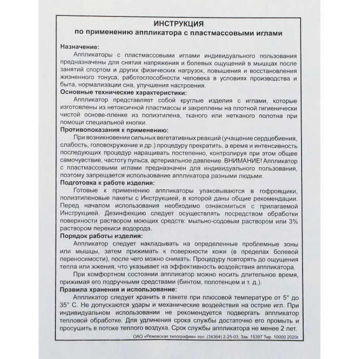Если на начальном этапе использования вы испытываете сильный дискомфорт от игл, рекомендовано применять иппликатор через одежду. Постепенно, с привыканием, можно переходить к прямому контакту с кожей.
