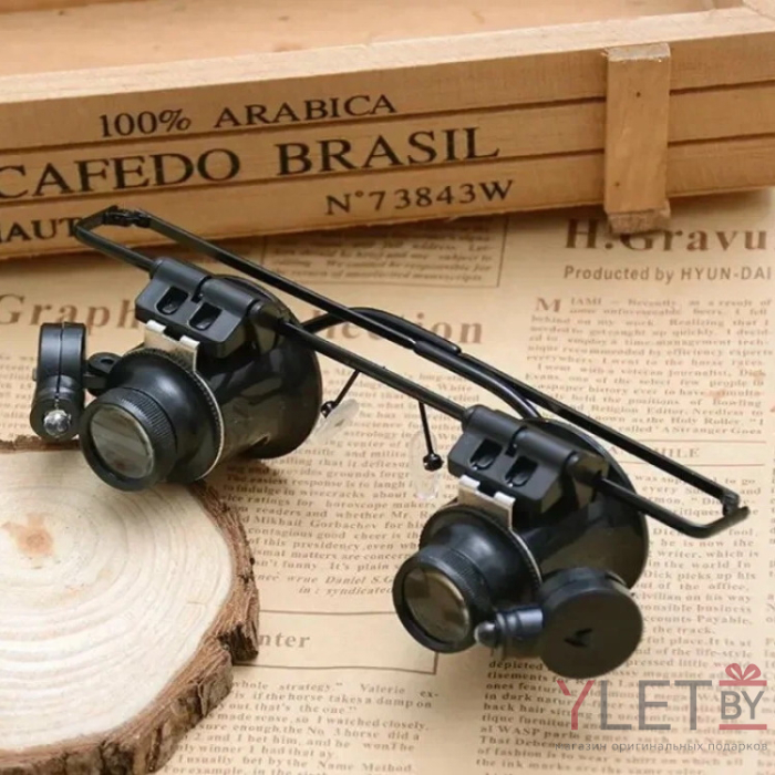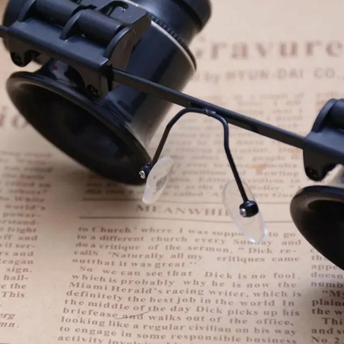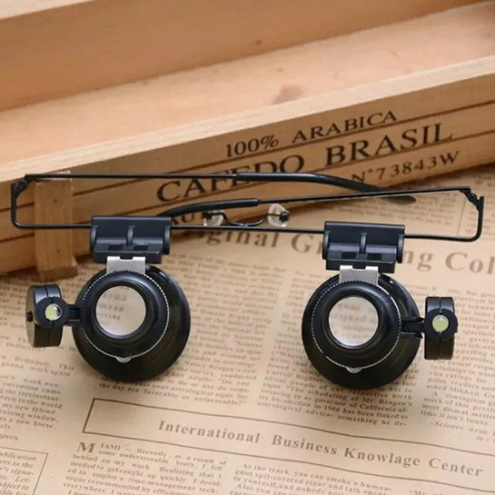 Увеличительное стекло, устанавливаемое на голову и используемое для выполнения точной работы. Каждое из двух увеличительных стекол крепится к оправе очков и наклоняется вверх или сдвигается в сторону. Эта модель подсвечивается двумя яркими белыми светодиодами. Бинокулярные лупы с подсветкой особенно полезны при работе в условиях низкой освещенности.