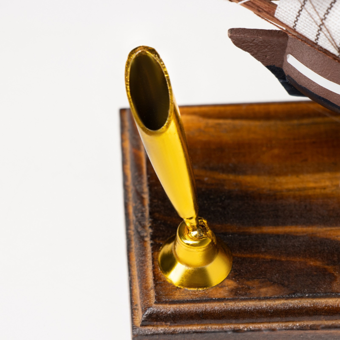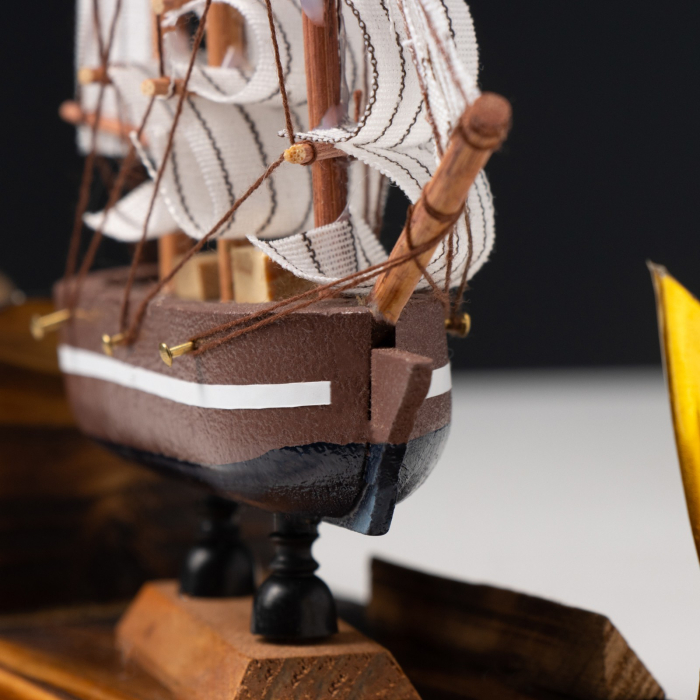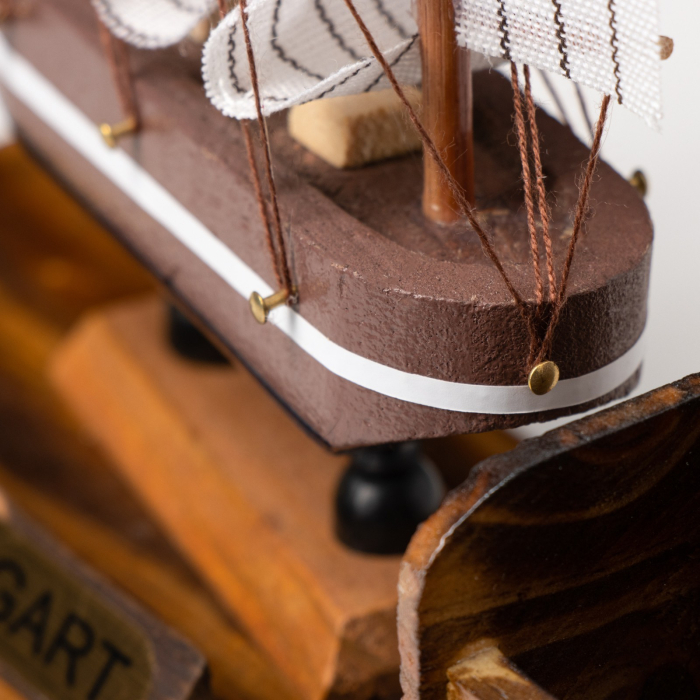 - Контрастные элементы: Белый парус на модели корабля эффектно выделяется на фоне коричневого корпуса, привлекая внимание и подчеркивая детали.