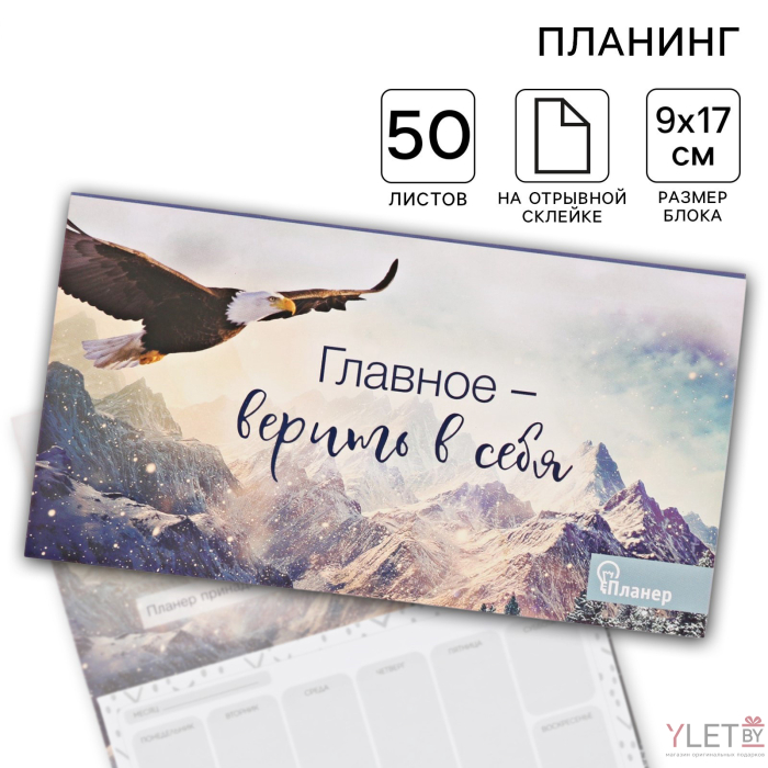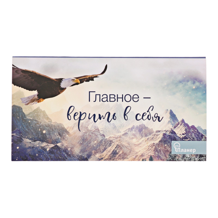 - Вдохновляющий дизайн: На обложке изображен орел, парящий среди величественных гор, символизирующий силу, мужество и свободу. Под крыльями орла расположена мотивационная фраза «Главное — верить в себя», которая будет подбадривать вас каждый день.