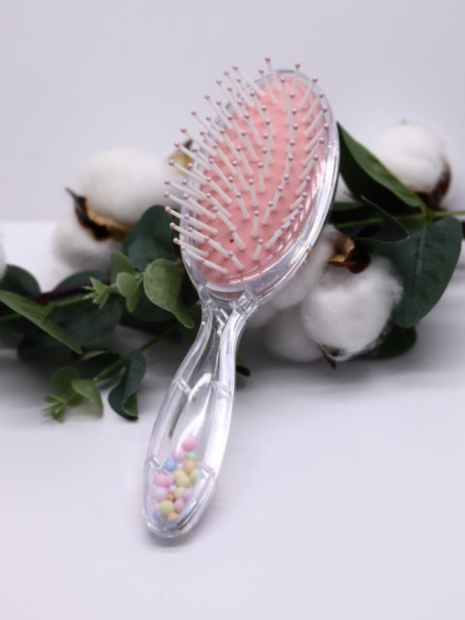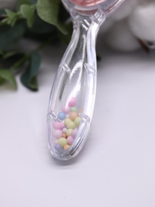 - Стильная прозрачная ручка: Прозрачная ручка придаёт расчёске особый шарм, добавляя ей элегантный вид. Она станет не только практичным инструментом, но и стильным аксессуаром в коллекции детских принадлежностей.