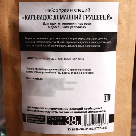 ---Набор для приготовления алкоголя «Кальвадос грушевый»: набор трав и специй 38 г., штоф 500 мл., инструкция