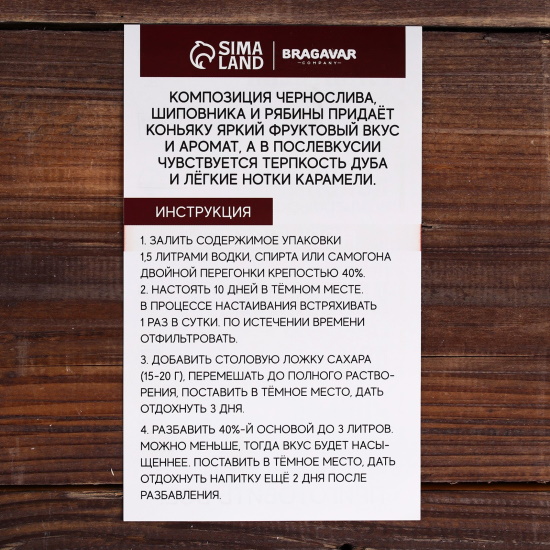 Состав: чернослив (плоды), дуб (щепа), шиповник (плоды), изюм темный, рябина красная (плоды), абрикос (ядро), чай черный.