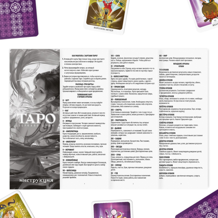 Таро — древнее и популярное карточное гадание. Оно позволяет найти ответы на вопросы прошлого, настоящего и будущего, а также получить совет от карт, понять причины своих поступков и поведения других людей. Благодаря универсальной колоде Таро «Зеркало души» вы сможете постичь тайну будущего и получить ответы на интересующие вопросы касательно отношений, работы и жизни в целом.