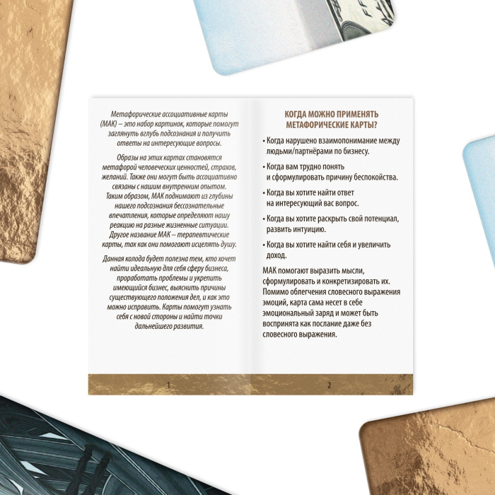 - 50 карт — каждая из которых содержит уникальные изображения, помогающие вам в анализе и самопознании.