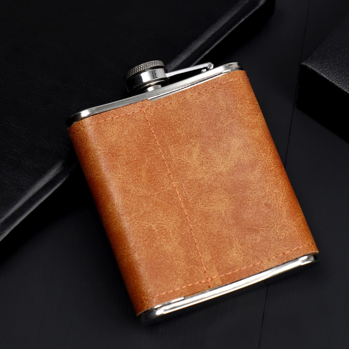 Фляжка из нержавеющей стали и искусственной кожи объёмом 210 мл — идеальный аксессуар для хранения и переноски напитков.