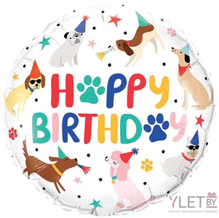 Шар (18''/46 см) Круг, С Днем Рождения (собачки в колпачках)