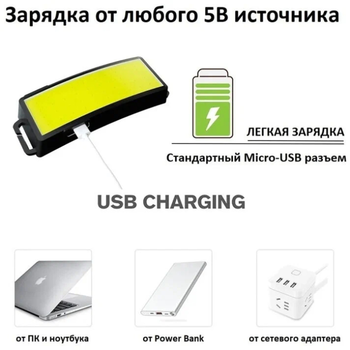 Фонарь налобный светодиодный LED-COB, кабель для зарядки micro-USB.