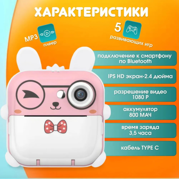 Фотоаппарат мгновенной печати, фотопринтер Зайчик, Розовый