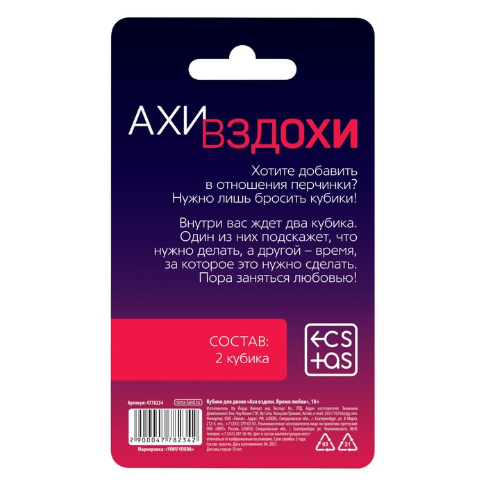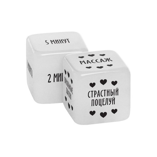 Здесь вас ждут 2 кубика. На одном из них указаны пикантные действия, которые партнёры должны совершить по отношению друг к другу, а на другом — время, за которое это нужно сделать. Просто бросьте кубики и испытайте новые грани наслаждения!
