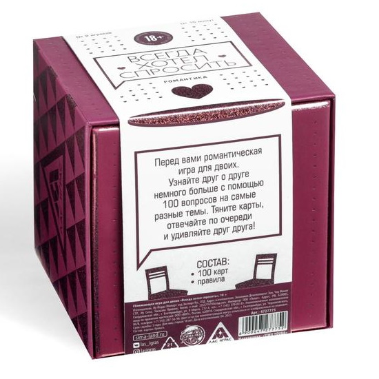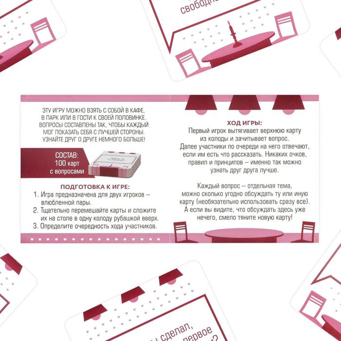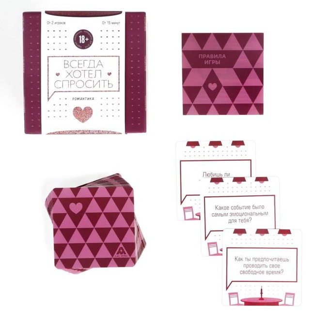 Это романтическая игра для двоих, которую можно взять с собой в кафе, парк или в гости к своей второй половинке. Узнайте друг о друге немного больше с помощью 100 вопросов на самые разные темы.