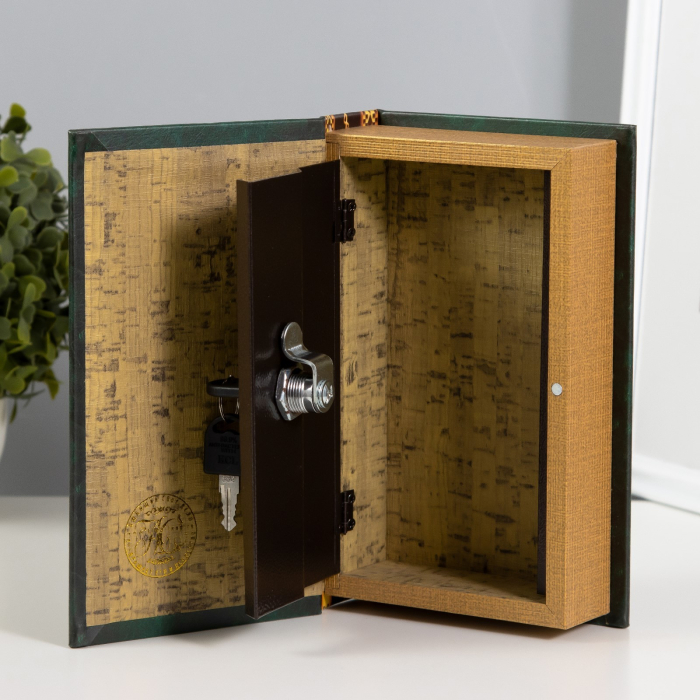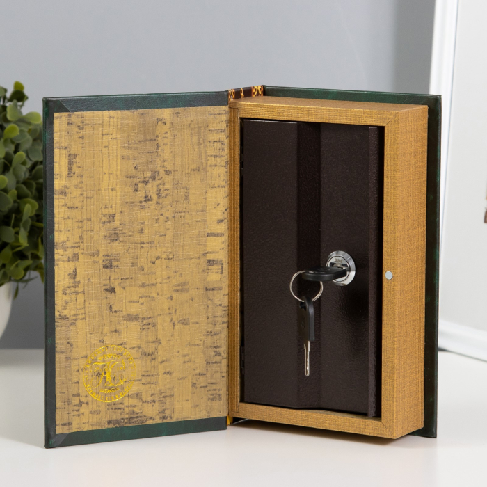 Сейф выполнен с элегантным дизайном, имитирующим настоящую книгу, и украшен интригующей надписью, что добавляет ему шарма и загадки. Внутри вы найдете достаточно пространства для хранения ценностей, документов или мелочей, которые хочется держать под защитой.