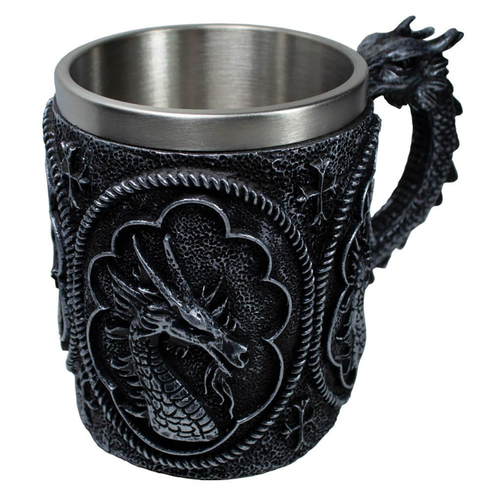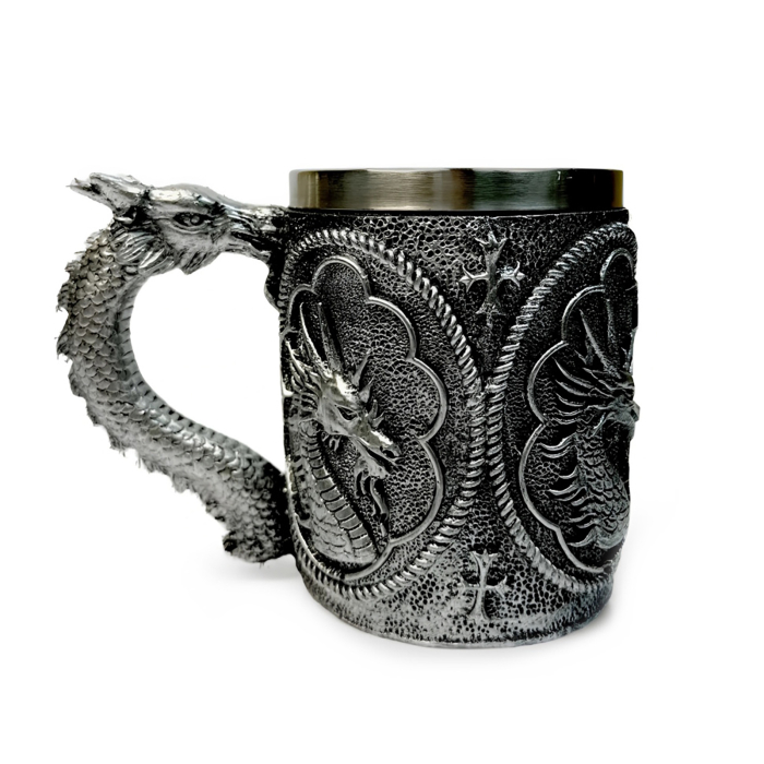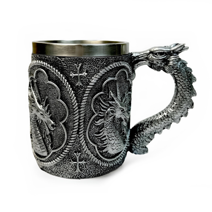 Это эффектный и необычный аксессуар, который станет ярким акцентом на вашем столе или отличным подарком для любителей мифологии и фэнтези. Внутренняя часть кружки выполнена из металла, что обеспечивает долгую сохранность температуры напитка — будь то горячий чай или холодный напиток. Внешний дизайн в виде головы дракона поражает детализацией и придает кружке особую выразительность и характер.