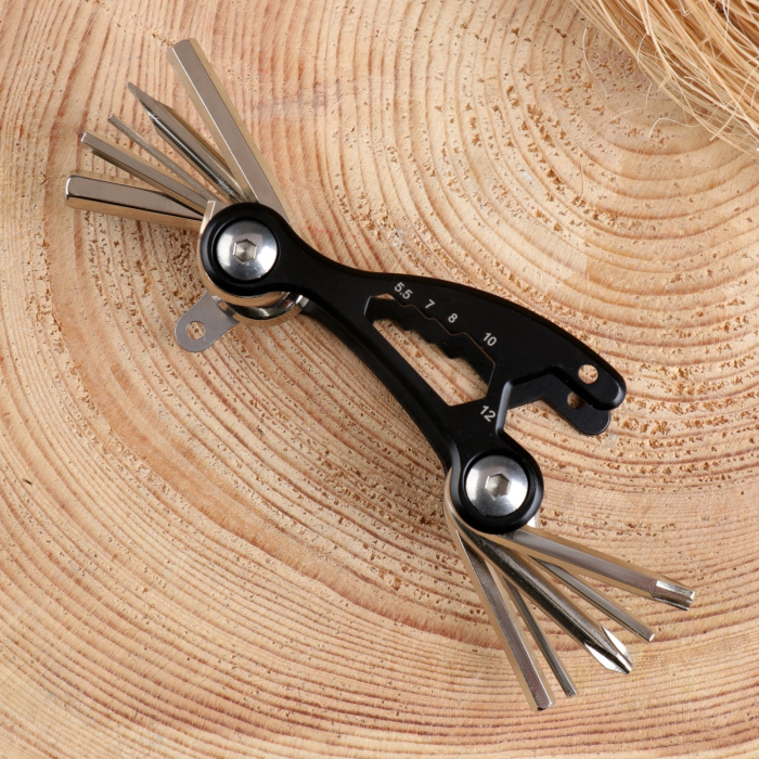 Мультитул 15 в 1 — идеальное решение для велосипедистов, объединяющее необходимые инструменты в одном компактном устройстве. В комплект входят шестигранники и другие элементы для быстрого ремонта техники, а миниатюрный корпус (13 см) легко помещается в рюкзак или карман.