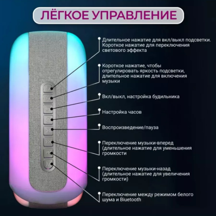 Представляем вашему вниманию портативную музыкальную беспроводную колонку. Это устройство, которое сочетает в себе множество функций, включая будильник, встроенные часы и светильник ночник.