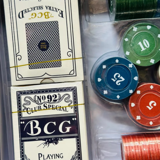 Набор 100 жетонов и жетона дилера. Вес жетона 11,5 г. Упакованы в металлическую коробочку.