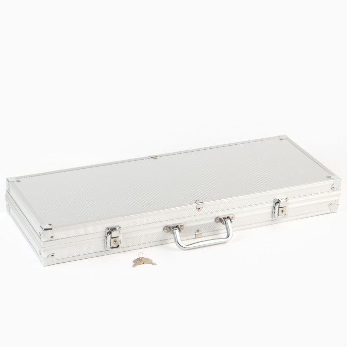 - Компактный металлический кейс: Кейс не только обеспечивает удобное хранение всех элементов, но и легко транспортируется. Он закрывается на ключ, что предотвращает потерю фишек и карт во время путешествий.