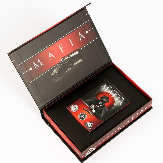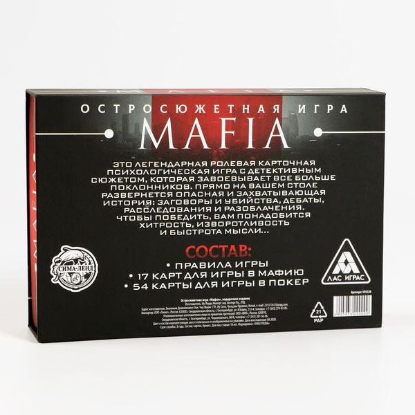 Комплект состоит из 54 карт, которые можно использовать как обычные игральные, так и для игры в мафию. Карты упакованы в эксклюзивную и стильную коробку.