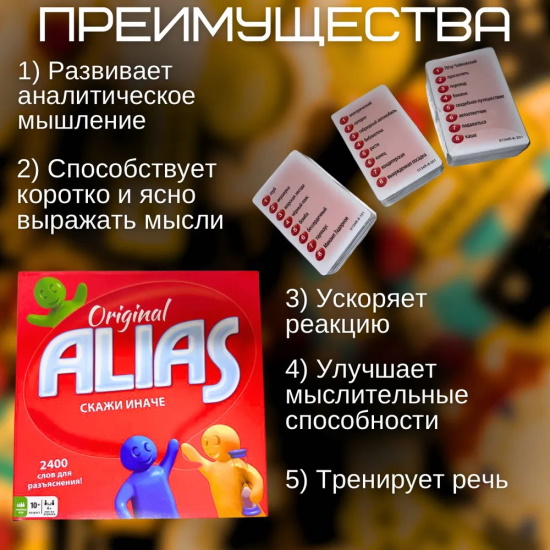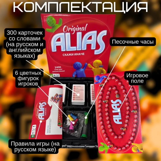 Настольная игра Алиас (Alias) «Скажи иначе». Увлекательная игра, разработанная в жанре ассоциаций, станет хорошим развлечением для любителей подобных головоломок, представляющих возрастную категорию 10+. Она поможет с интересом провести время семье и большой компании дома (рассчитана на 4-12 участников), на пикнике или вечеринке. Определяя круг участников, важно учитывать, что средняя продолжительность одной игровой сессии варьируется в диапазоне от 45 до 90 минут.