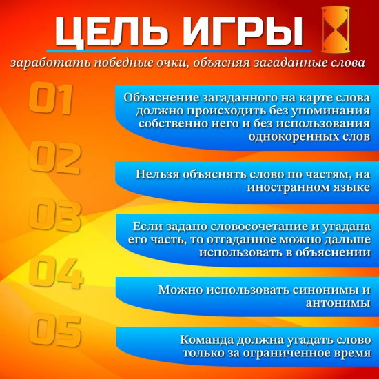 Комплект игры: Игровое поле, 300 карточек со словами, Песочные часы, 6 цветных фигурок игроков, Правила игры (на русском языке)