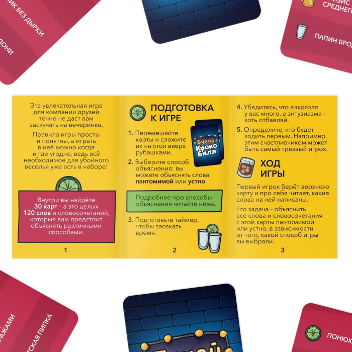 Подготовьтесь к незабываемому вечеру с игрой «Бухой крокоБилл», которая станет настоящей изюминкой вашей зажигательной тусовки! Эта игра наполнит ваши собрания смехом, азартом и легким алкогольным настроением, ведь вам предстоит не только объяснять слова разными способами, но и много выпивать!