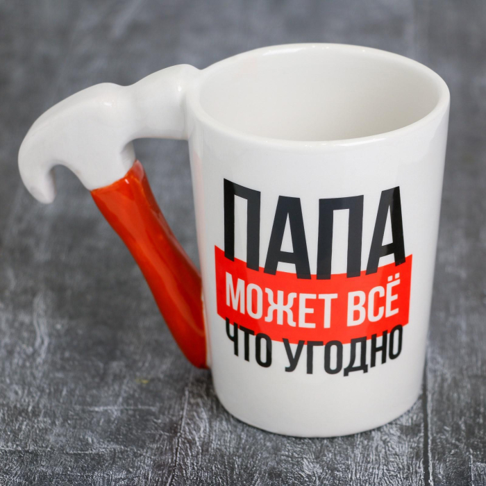Яркая надпись «Папа может всё что угодно» не только радует глаз, но и вдохновляет, придавая уверенности и подчеркивая важность роли отца в семье. Уникальная ручка, выполненная в форме молотка, добавляет юмора и оригинальности, делая каждый глоток не только приятным, но и веселым.