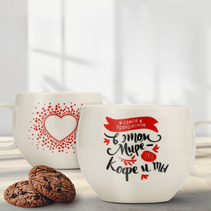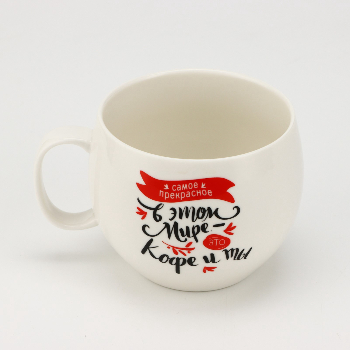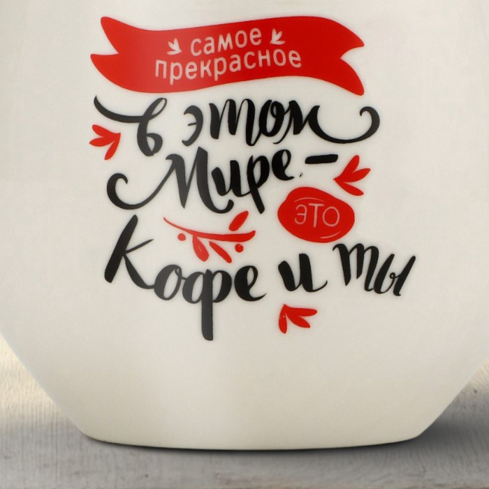 На кружке написано: «Самое прекрасное в этом мире — это кофе и ты», что делает её не только практичным, но и романтичным аксессуаром. Она напоминает о том, как важно ценить приятные моменты и общение с теми, кого мы любим.