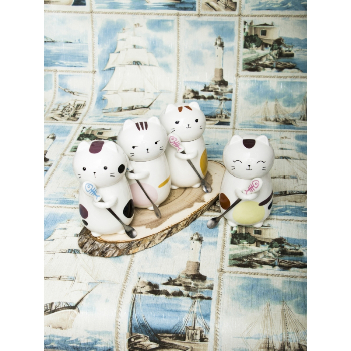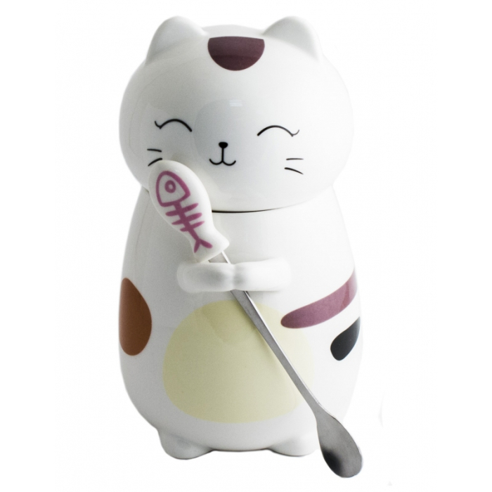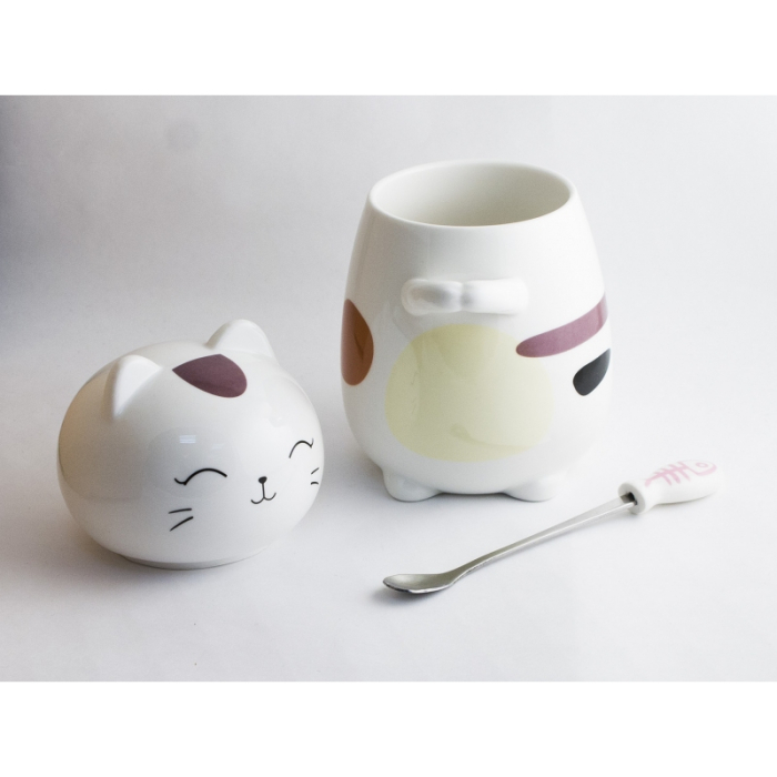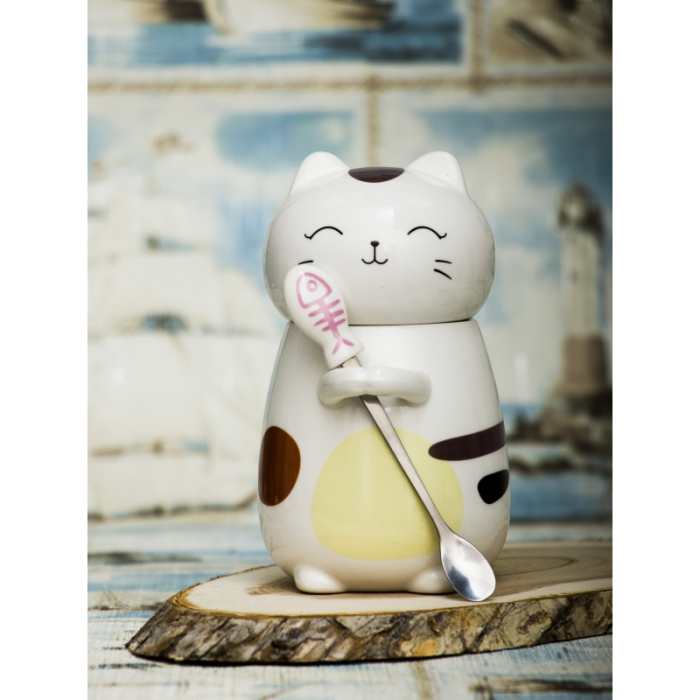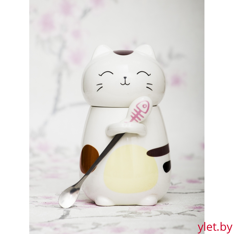 - Дизайн: Кружка в форме пузатого котика с головкой, которая служит крышкой, не только защищает напиток от остывания, но и добавляет элемент игры и веселья. Котик держит в своих лапках забавную рыбку-ложку, которая делает процесс чаепития еще более занимательным.