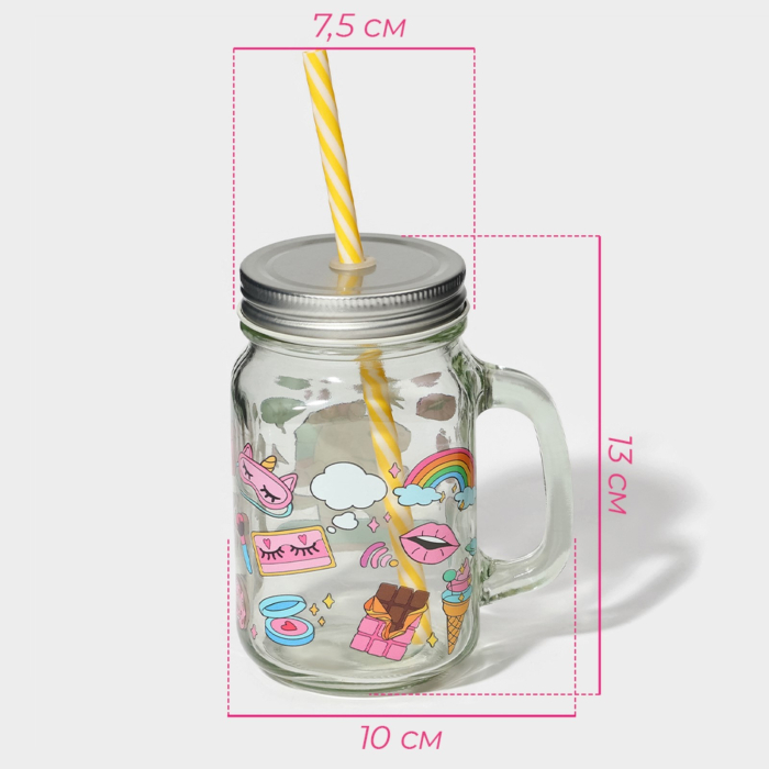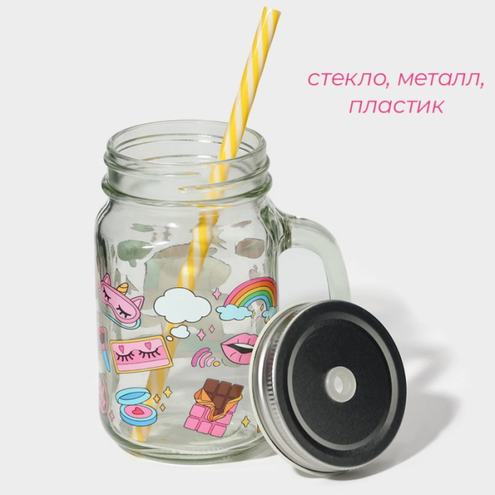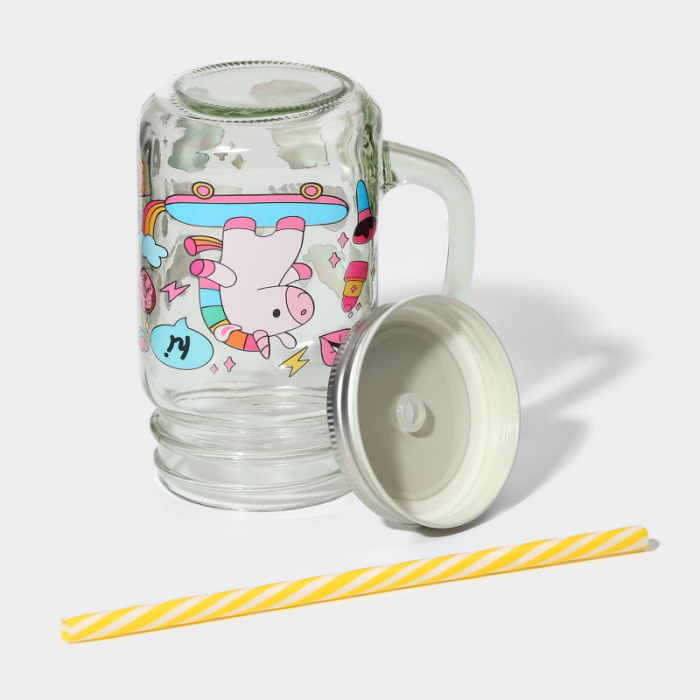 Кружка стеклянная с крышкой и трубочкой Единорог, 450 мл