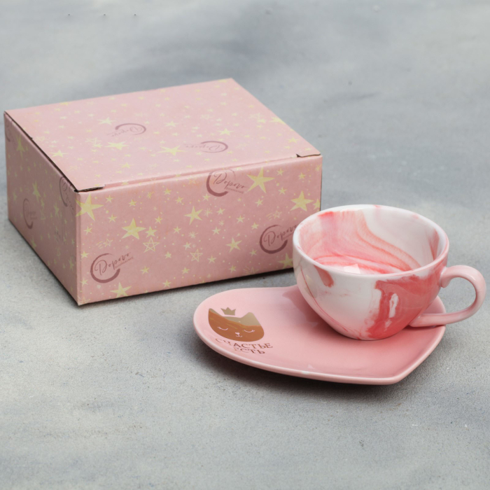 ---Подарочный набор керамический «Счастье есть»: кружка 120 мл, блюдце, цвет розовый