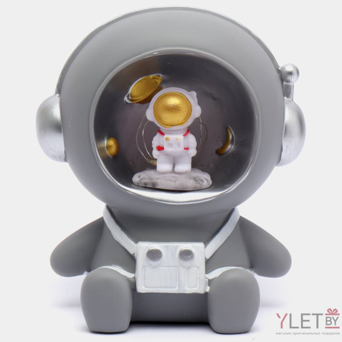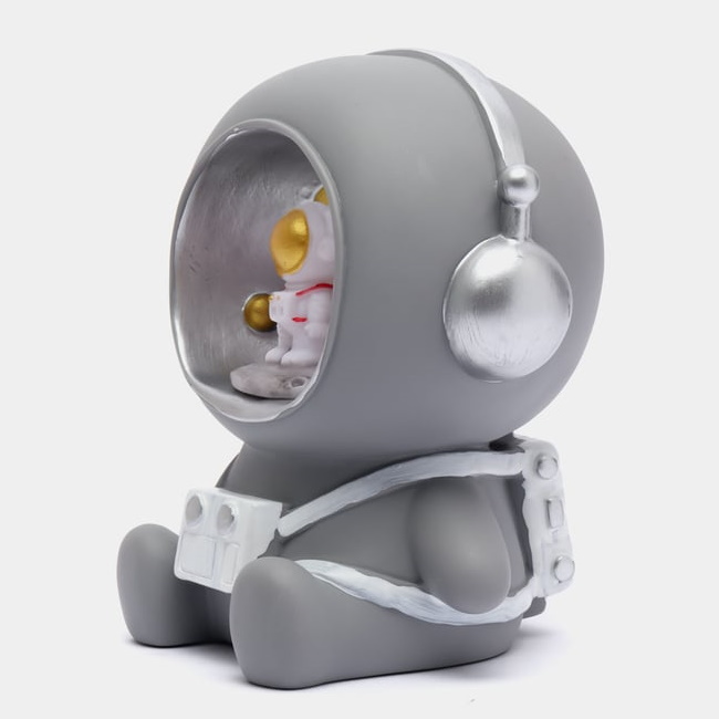 Среднего размера статуэтка мультяшного космонавта, которая служит корпусом необычному светильнику. В шлеме космонавта вместо стекла — пространство с золотистыми стенками, а посреди него расположена еще одна "космическая" фигурка, окруженная "звездами". Вернее, светодиодами на гибкой проволоке, которые можно разместить внутри светильника так, как вы захотите: плотно опоясать маленького астронавта или, например, полностью спрятать их у него за спиной.