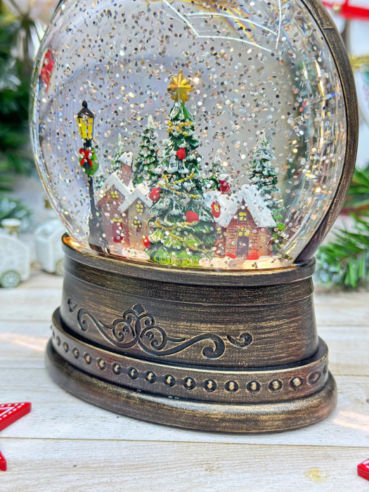 Снежный шар с подсветкой музыкальный Ретро фонарь круглый плоский "Заснеженный город" d = 15 см, высота 22 см