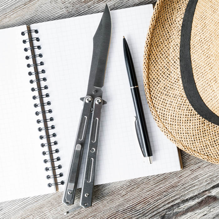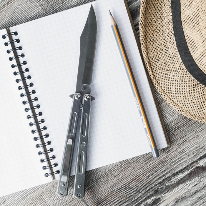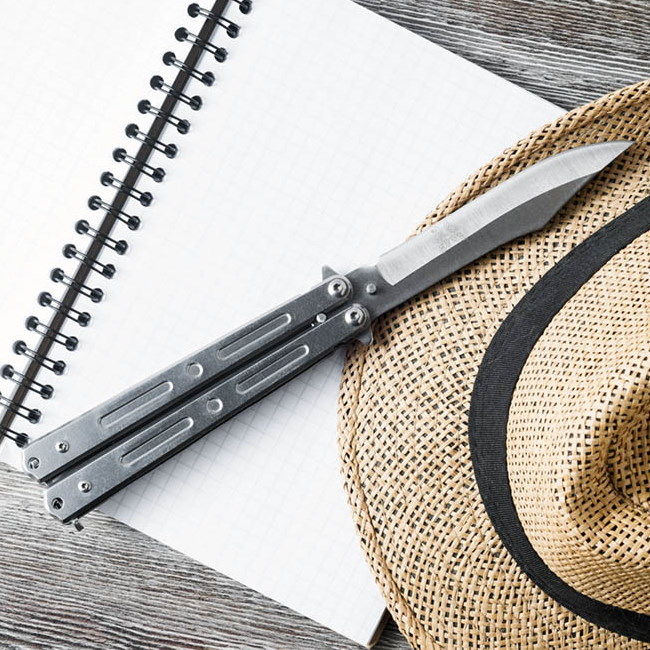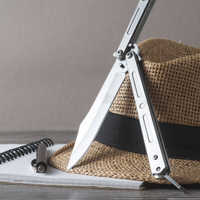 Нож складной бабочка не является холодным оружием. Прибор имеет простую конструкцию и быстро открывается одной рукой. Это даёт ему преимущества в экстремальных условиях. В разложенном виде «бабочка» надёжно фиксируется. В закрытом состоянии остриё ножа полностью скрывают рукоятки, поэтому ему не нужен чехол. Благодаря симметричности «бабочки», с ним удобно работать как правой, так и левой рукой.