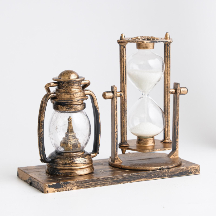 Представляем восхитительные песочные часы, которые не только прекрасно исполняют свою функцию, но и служат уникальным декоративным элементом. Один сосуд заполнен мелким песком, который плавно сыпется вниз, а второй выполнен в форме изящной керосиновой лампы, внутри которой расположена миниатюра Эйфелевой башни. Эти часы объединяют в себе элементы романтики и элегантности, привнося атмосферу Парижа в ваш дом. Их уникальный дизайн станет отличным акцентом в интерьере и привлечет внимание гостей, а также поможет вам отслеживать время во время отдыха или работы.