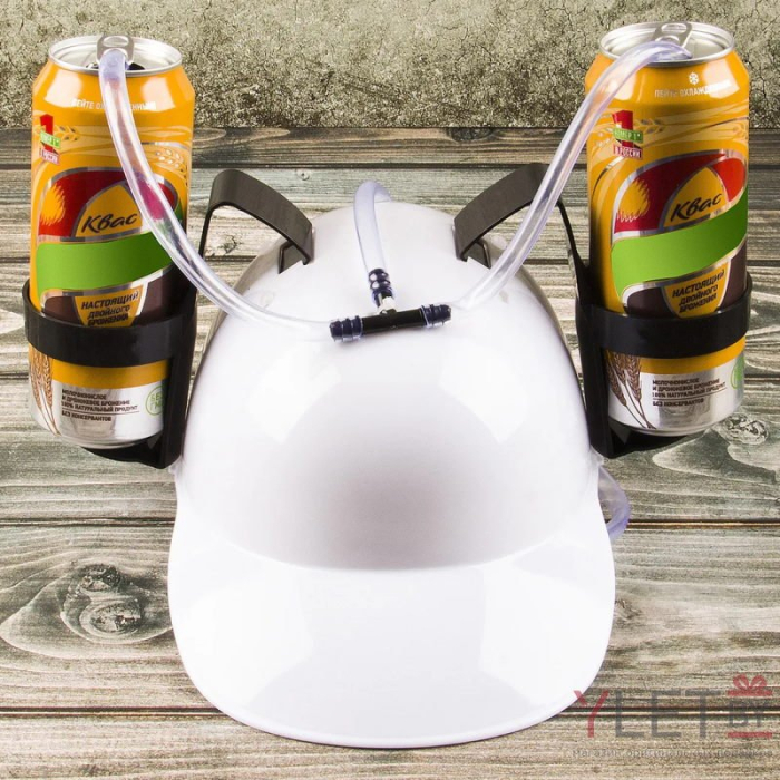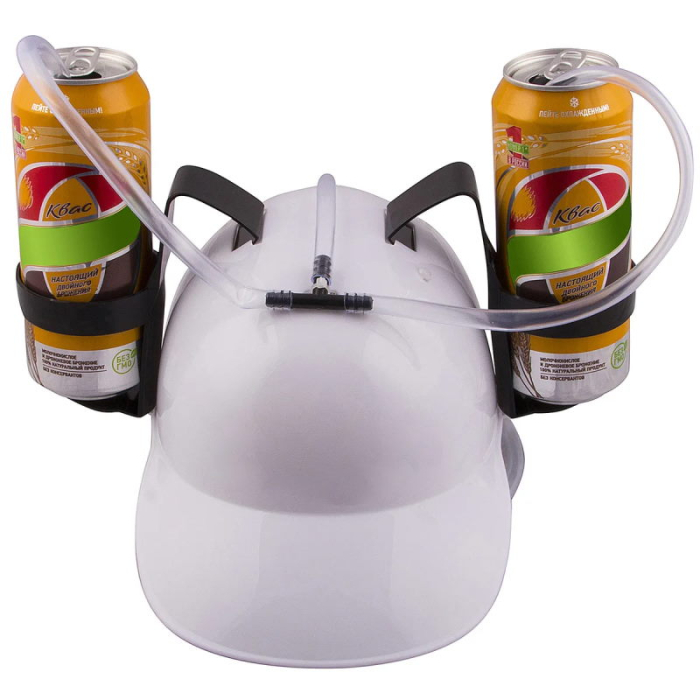 Каска не просто нахлобучивается на голову. Система крепления состоит из нескольких ремешков и не позволяет случайно соскользнуть. На подставке легко разместить две стандартные банки с пивом, квасом, джин-тоником или газировкой. Причем утолять жажду через специальные прозрачные трубочки! Жидкость может поступать как из каждой баночки по отдельности, так и из двух сразу. Это наверняка понравится любителям коктейлей. Зачем смешивать компоненты в шейкере? Они и в желудке отлично дополнят друг друга!