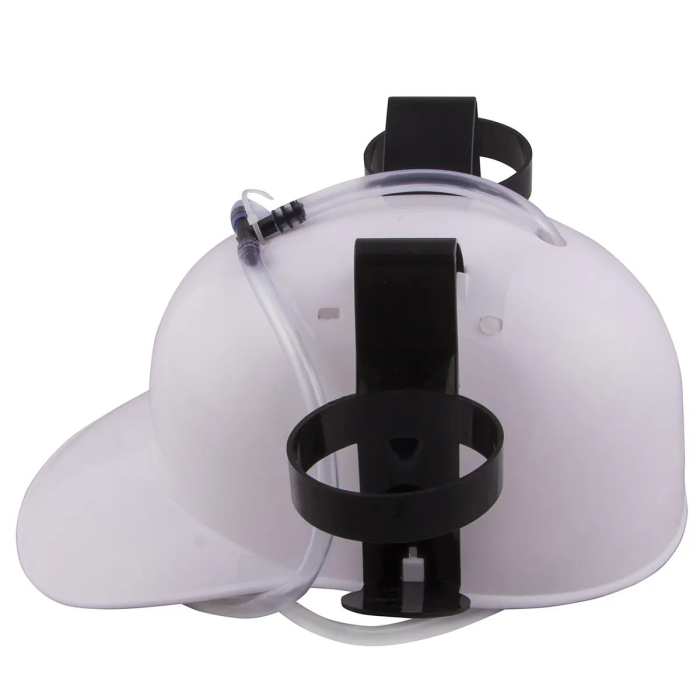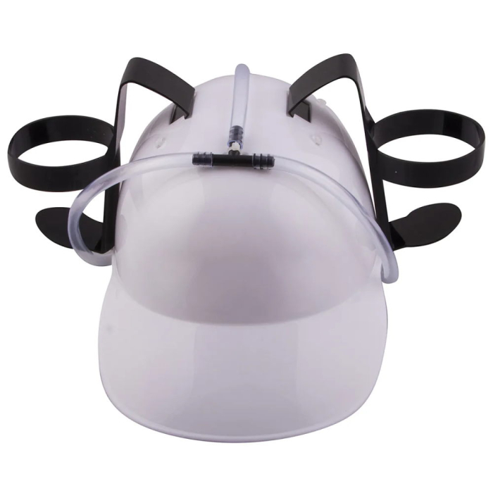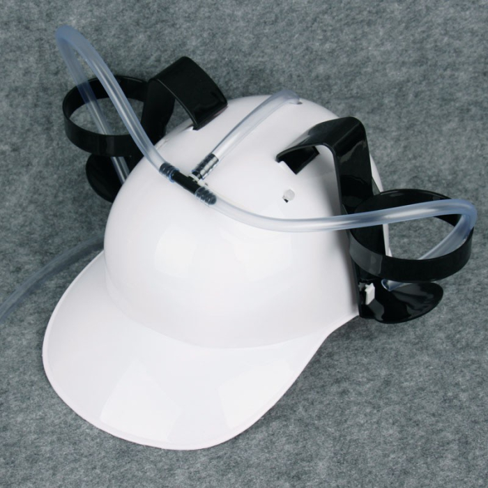 Удобный шлем для напитков освободит Ваши руки для возможности заняться чем-то другим. По бокам каски есть крепления в которых можно разместить разные напитки. Имеет трубку,по которой поступает жидкость с регулятором для интенсивности движения напитка по ней. Размер шлема регулируется.