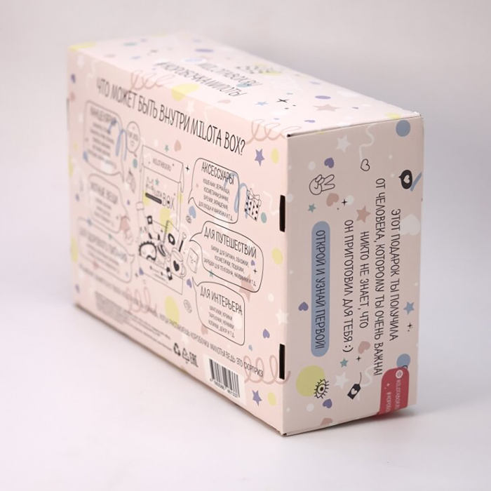 Размеры коробочки составляют 28,5 х 18,5 х 9,5 см, а общий вес – 900 граммов. Подарите себе или своим близким мгновения радости и вдохновения с MilotaBox!
