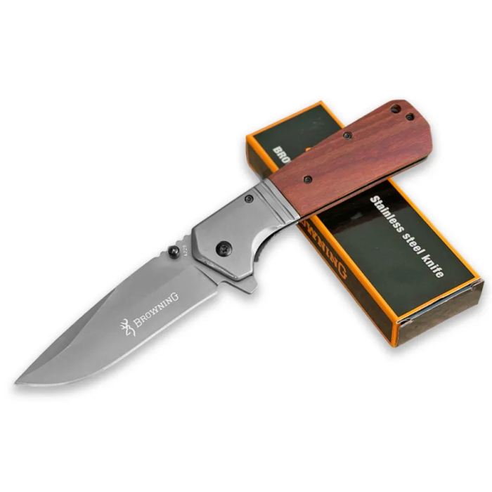 Нож Browning произведен из качественной стали 420С. Рукоятка ножа изготовлена из металла с деревянными накладки. На рукоятке есть крепление-клипса, которое позволяет носить нож цепляя его за край одежды или сумки. На тыльной части рукоятки расположено отверстие для темляка.