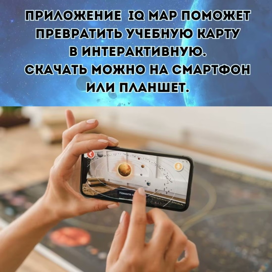 А если просто рассматривать карту станет скучно, просто скачайте бесплатное мобильное приложение IQ Map, и наши герои всезнайка Ариша с любознательными братьями Темой и Митей и четвероногими друзьями Астором и Ириской расскажут все самое интересное о космосе. Вы сможете приблизить и покрутить любой космический объект, а еще выйти в открытый космос.