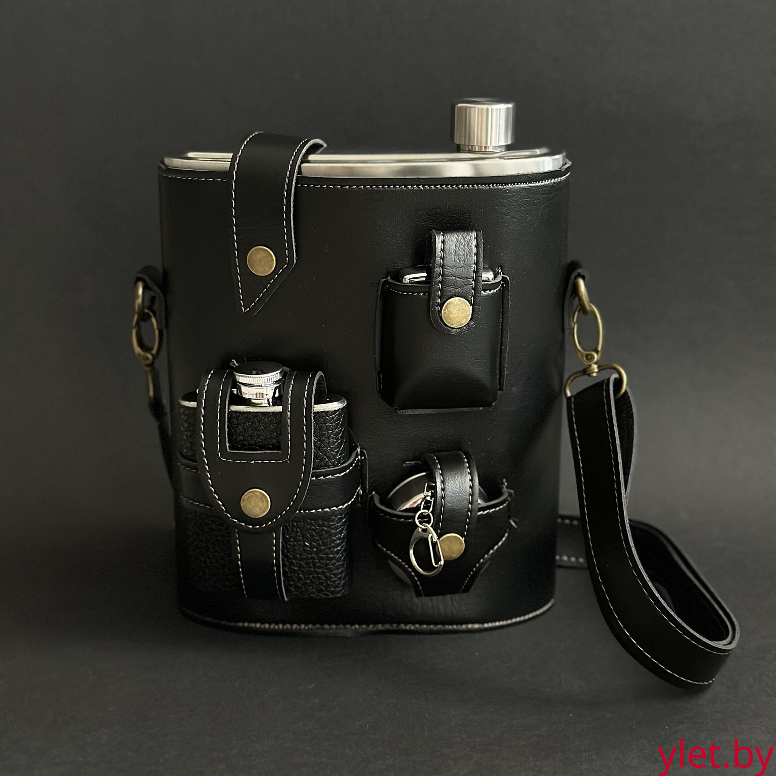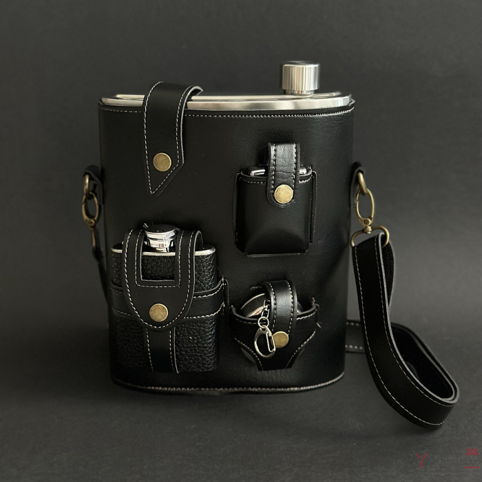 Набор походный 4 предмета черный (фляжка 1,4 литра, фляжка 120 мл, зажигалка бензиновая, складная стопка, ремень для переноски)