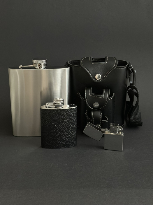 Набор походный 4 предмета черный (фляжка 530 мл, фляжка 120 мл, зажигалка бензиновая, ремень для переноски)
