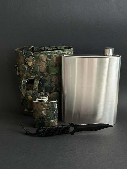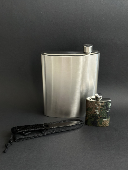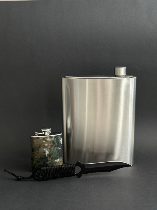 В дополнение к основной фляге в набор включена стильная фляжка объёмом 120 мл, которая станет идеальным решением для транспортировки небольшого количества крепкого напитка. Теперь вы сможете поднять тост с друзьями в любое время и в любом месте, добавив особую нотку к вашим совместным приключениям.