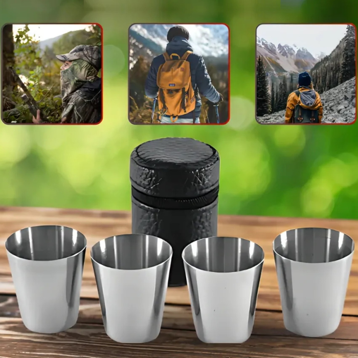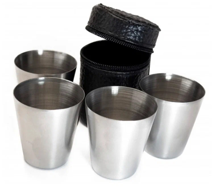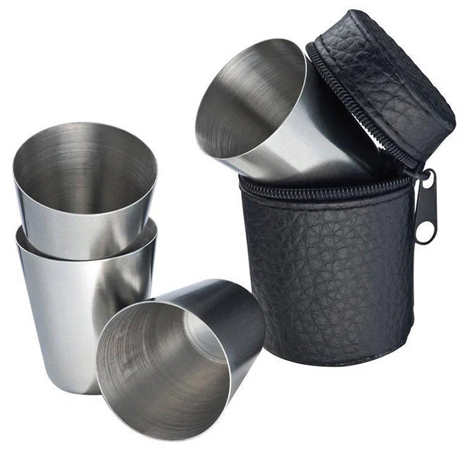 Подарочный набор стопок рюмочек объемом 150 мл — идеальный подарок для мужчины на 23 Февраля или любой другой праздник. Подойдут в качестве корпоративных подарков коллегам, камраду по службе, верному товарищу, сослуживцу, дорогому дедушке. Набор состоит из четырёх стопок, упакованных в компактный футляр на молнии из искусственной кожи. Благодаря небольшому размеру, их удобно брать с собой в поход, на рыбалку, охоту, в машину или просто носить в рюкзаке. Стопки изготовлены из нержавеющей стали, поэтому прослужат вам долгие годы.