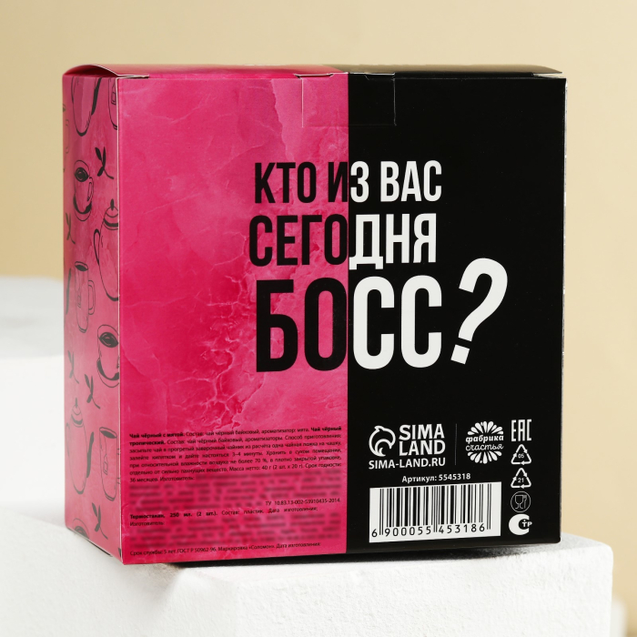 Набор парных термостаканов с чёрным чаем, 2 шт. х 250 мл. «Босс», мята 20 г., тропические фрукты 20 г.
